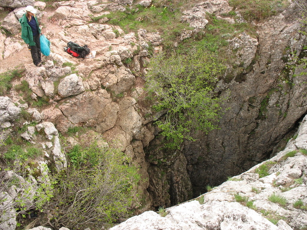 Похоже мы начали подходить к нужному участку. Как свидетельство – группы спелеологов, высиживающих словно чайки на голых скалах вокруг входов в пещеры. Навигационного прибора нет, поэтому приходится часто наводить справки о местонахождении Большого Бузулука. Медленно продвигаемся к цели. Идти нужно осторожно ввиду характера Караби. Где угодно в траве может лежать незаметно камень, об который легко споткнуться или вывихнуть ногу. Уже дойдя до Б. Бузулука и выбрав место под стоянку в одной из близлежащих воронок я чуть не умудрился получить травму. Камень, назаметно лежащий в траве, чуть не послужил причиной неприятных переживаний. Моя левая нога, споткнувшись об камень, приложила к колену такое усилие, от которого колено чуть не разогнулось в обратную сторону. Очень неприятный и болевой момент. Надо быть очень осторожным. Я аж до конца маршрута после этого нащупывал впереди себя в траве камни.