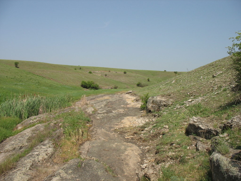 В нижней части заповедника балка разделяется на два рукава. Больший – к трассе, на восток. Меньший – к западу. По большему я решил уже не ходить, тем более он очень хорошо просматривается с высоты. Дно балки неровное и изобилует небольшими ямками, поэтому идти по нему надо осторожно. Склоны были усеяны камнями. Скорее всего обломками осадочной породы, которая покрывает гранитные слои, подступающие снизу.